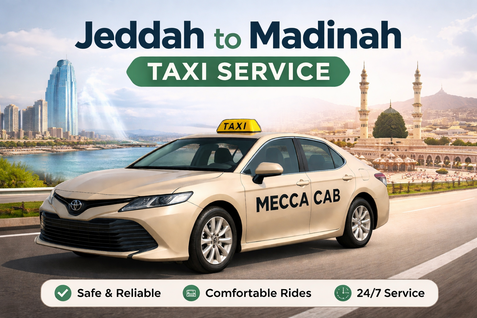 Choose Mecca Cab for a safe, comfortable, and reliable Jeddah to Madinah taxi service. Contact us today to book your ride and enjoy a peaceful journey with professional service.